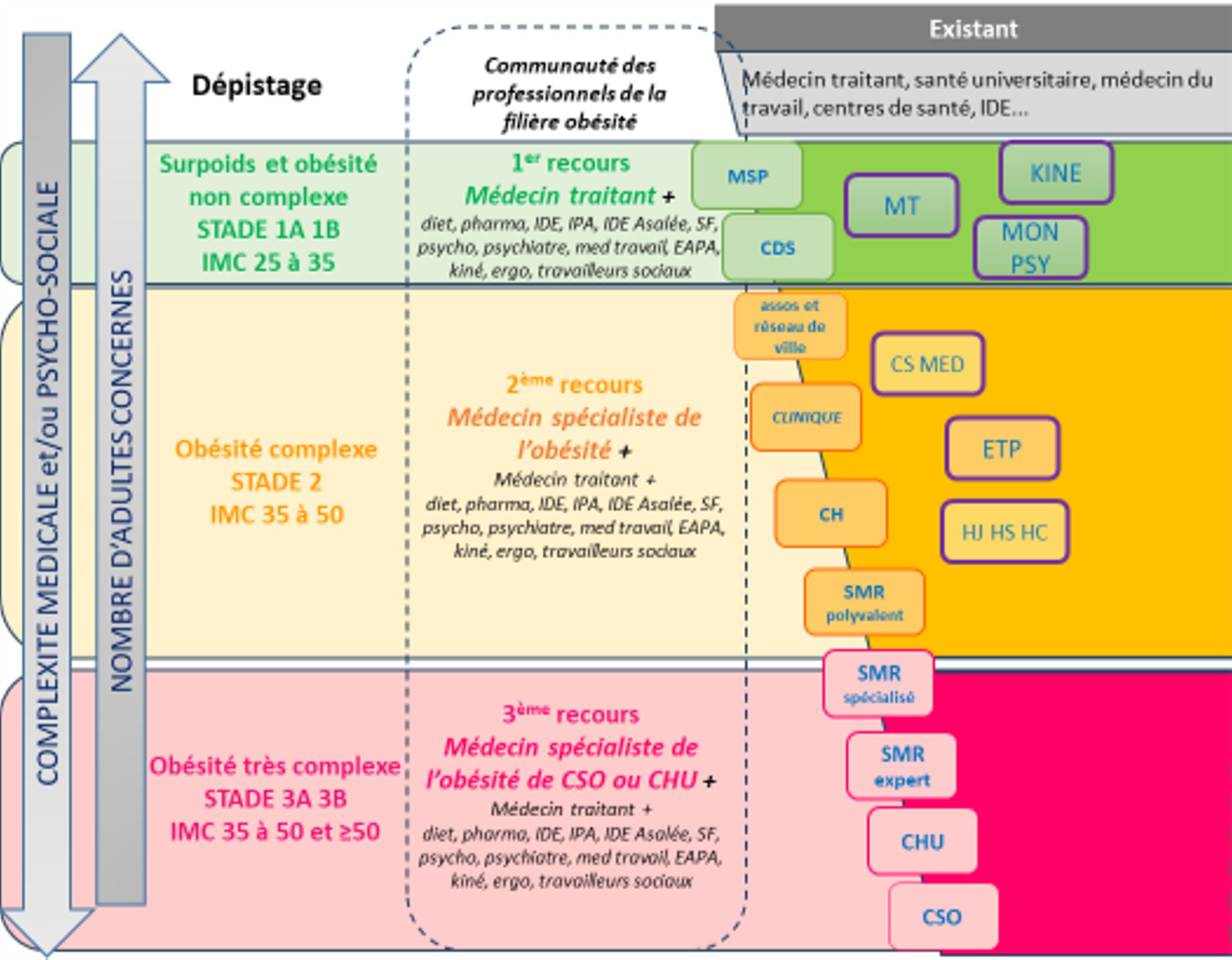 La prise en charge de l’obésité est graduée et l’on distingue trois niveaux de soins, selon le stade de sévérité ou de complexité de l’obésité.