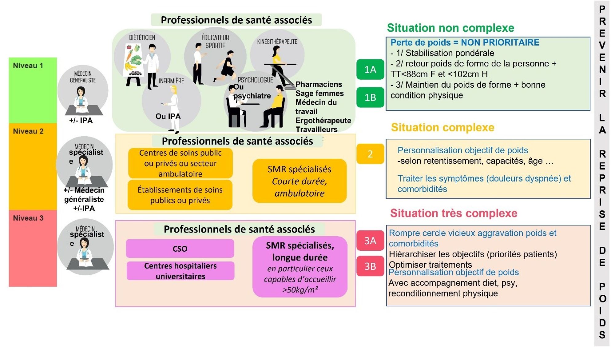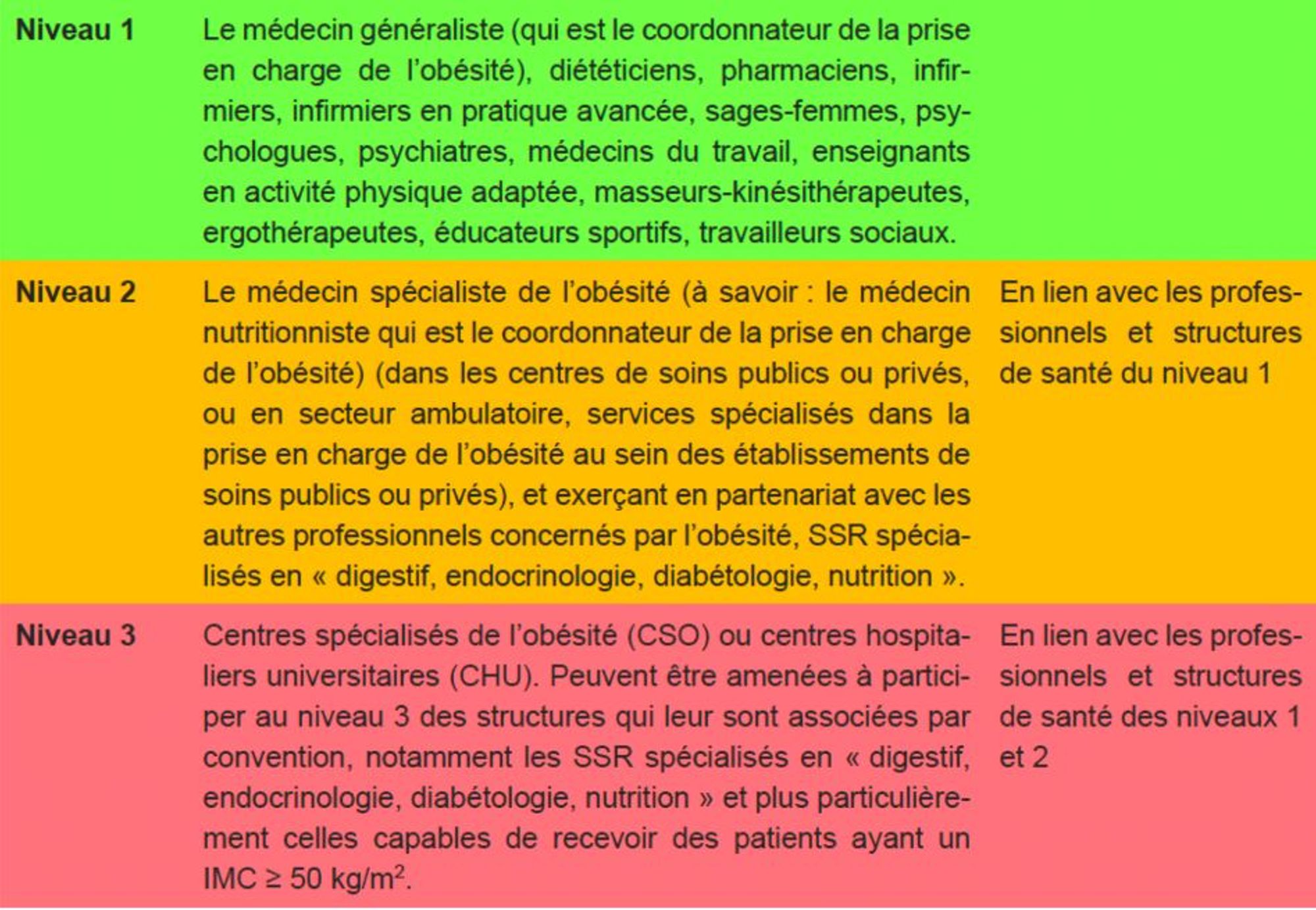 Le parcours de soins de la personne en obésité repose d’abord sur le soin primaire : c’est-à-dire coordonné par le médecin généraliste ou parfois par une infirmière en pratique avancée et qui pourra faire appel à de nombreux professionnels paramédicaux (diététiciennes, enseignant en activité physique adaptée, psychologue si besoin entre autres) ainsi que des équipes d’éducation thérapeutique voire avec des associations de patients, en s’intégrant dans le tissu social pour accompagner sur le long terme les modifications du mode de vie.