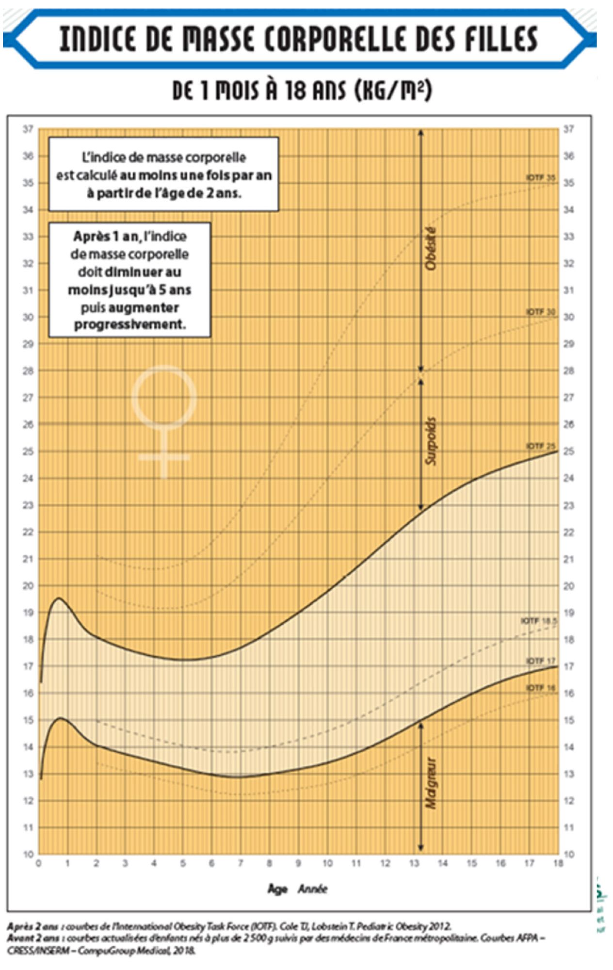 La courbe d’IMC permet de faire le diagnostic de surpoids lorsque l’IMC est au dessus du seuil de l’IOTF 25 ou d’obésité lorsque l’IMC est au dessus du seuil de l’IOTF 30 [1].